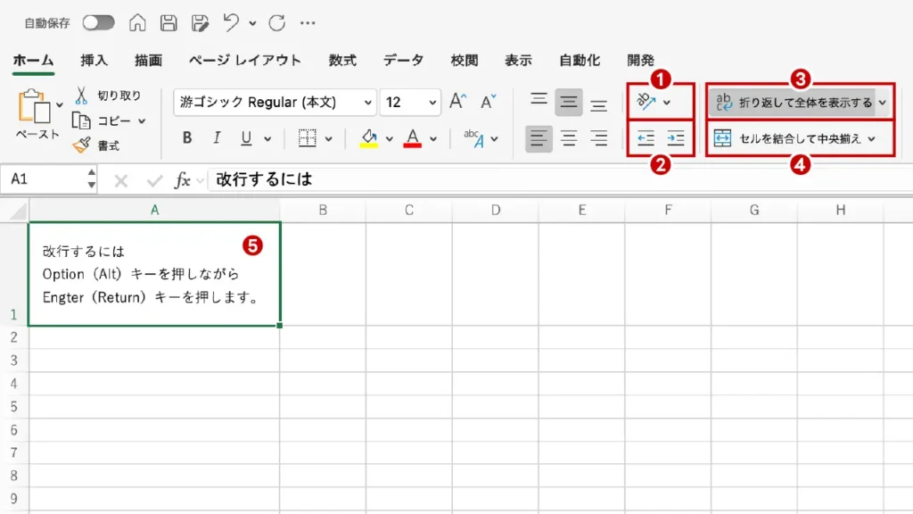 - ❺ セル内改行(Alt + Enter):意図した場所で改行を入れたい時の必須テクニックです。