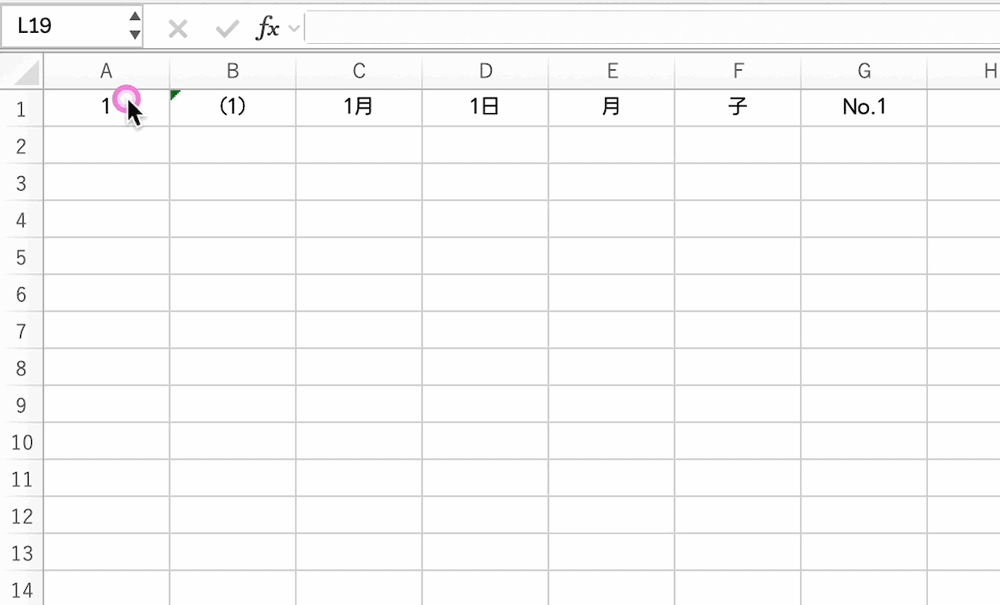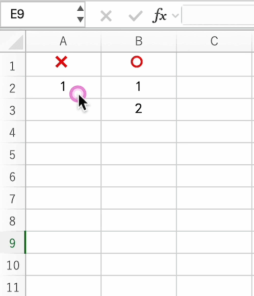 実は、セルに「1」だけを入力してドラッグしても、そのままでは「1」がコピーされるだけです。連番にしたい時は、まず「1」とその下のセルに「2」を入力します。その2つのセルをセットで選択してから、右下の■(フィルハンドル)をドラッグしましょう。これでExcelが「1ずつ増やすんだな」という法則を理解してくれます。