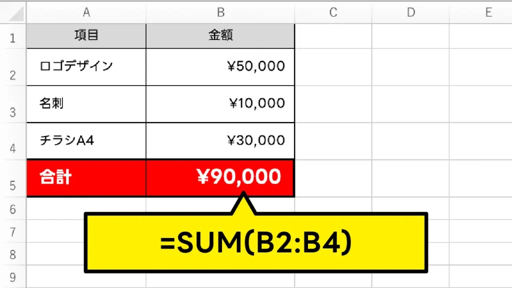 指定した範囲の数値をすべて合計します。例えば、複数の制作物の「合計金額」を出したり、撮影に必要な「機材の総数」を数えたりする際に使います。