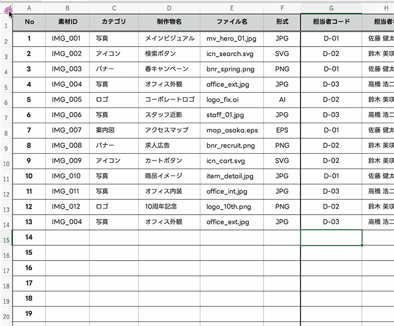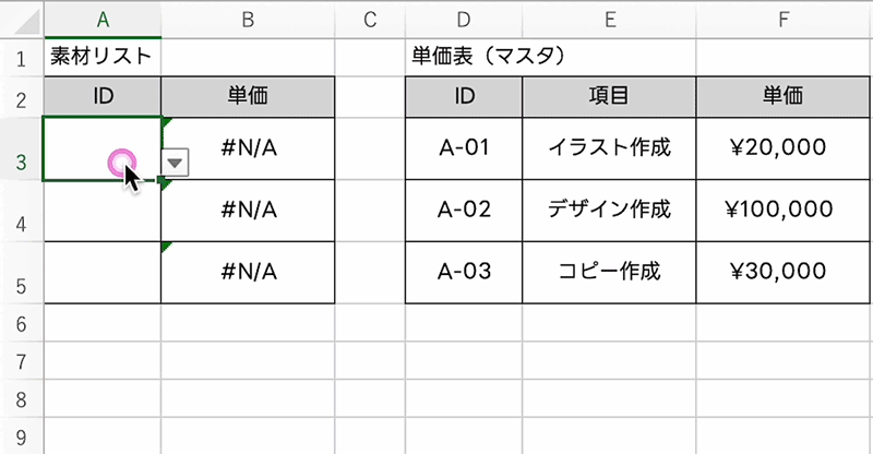 - 連番・日付を一気に入力:セルの右下にある小さな四角をドラッグするだけで、1, 2, 3…などの数字や日付を自動入力できます。何百個もの素材に番号を振る際、手入力のミスをゼロにします。
