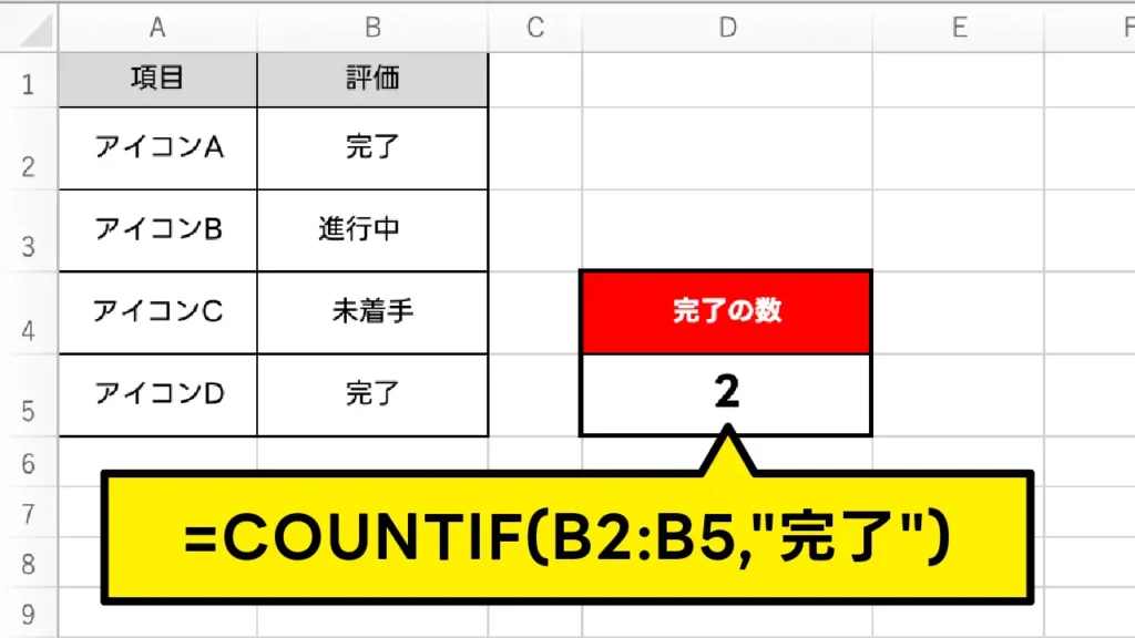 指定した範囲の中で、特定の条件に一致するセルの個数だけを数えます。例えば、素材管理リストの中で、ステータスが「完了」になっているものがいくつあるか、あるいは「修正あり」がいくつあるかを一瞬で集計できます。