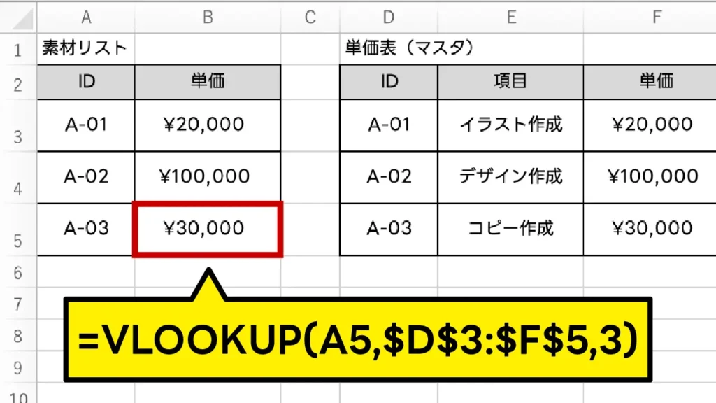 別の表から、特定のキーワードに一致するデータを探して持ってくる、実務で最も重宝される関数です。例えば、「クライアントコード」を入力するだけで、別シートのリストから「クライアント名」や「住所」を自動で表示させたり、素材IDから「単価」を引っ張ってきたりする際に非常に便利です。