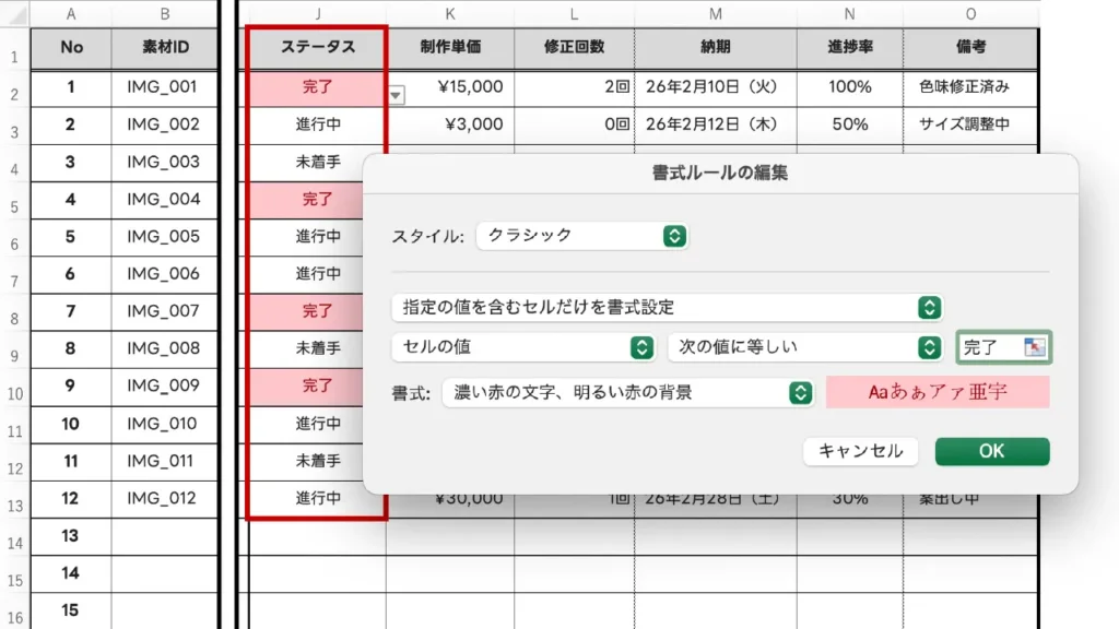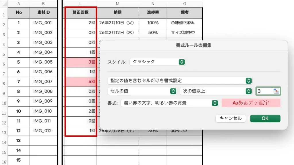 設定した数値を超えるデータに色をつけます。例えば、制作予算をオーバーした金額や、想定以上の修正回数(3回以上など)を赤字にして目立たせる際に使います。