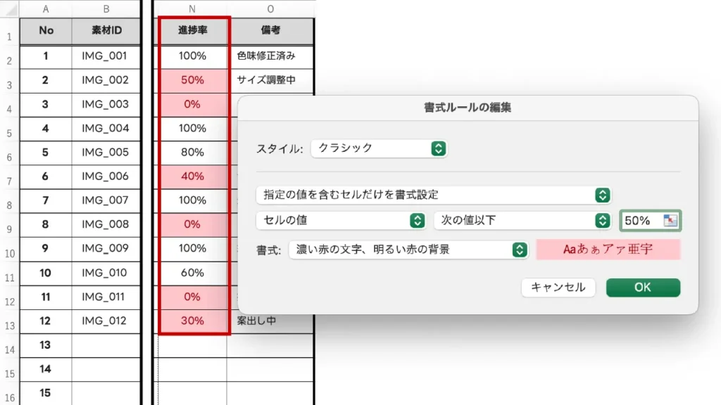 「10以上20以下」のように、特定の範囲にある数値に色をつけます。例えば、進捗率が「10%〜90%」の間にあるセルを黄色にして、現在まさに「動いているタスク」だけをパッと見分けられるようにする際に便利です。