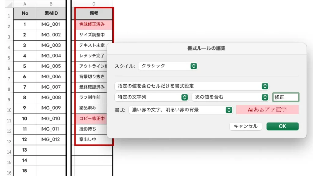 指定した文字が含まれるセルに色をつけます。ステータス欄に「至急」や「要確認」という文字が入ったときだけ自動でセルを赤く染め、即座に対応が必要なものを見分けられます。