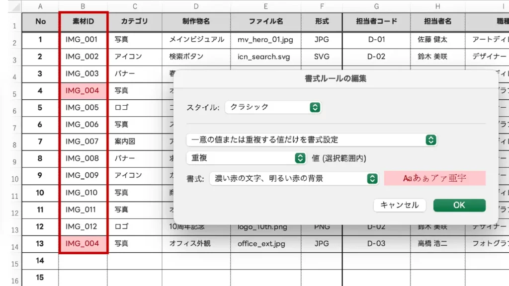 デザイナーに最も使ってほしい機能です。 全く同じデータが2つ以上ある場合に色がつきます。「素材ID」や「ファイル名」がダブってしまうとシステムエラーの原因になるため、入力ミスを未然に防ぐために必須です。