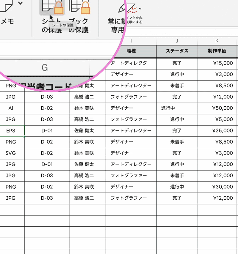見積書の計算式やマスタデータなどは、渡した相手がうっかり編集してしまうと資料全体が壊れてしまいます。保護をかけることで、入力してほしい場所だけを編集可能にし、重要な数式を守ることができます。