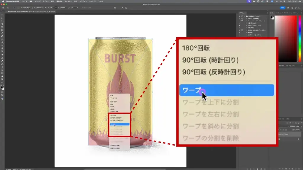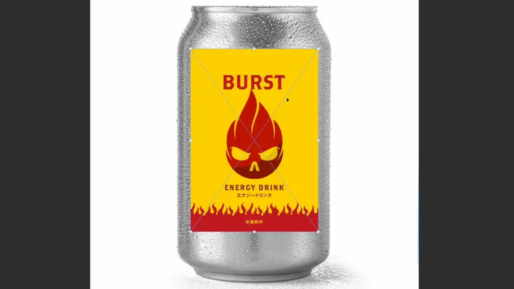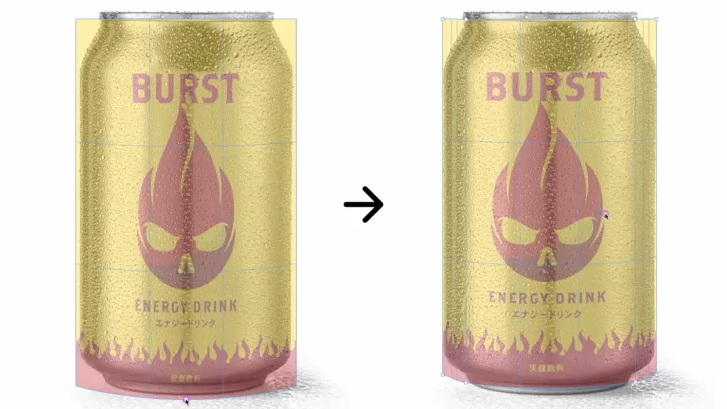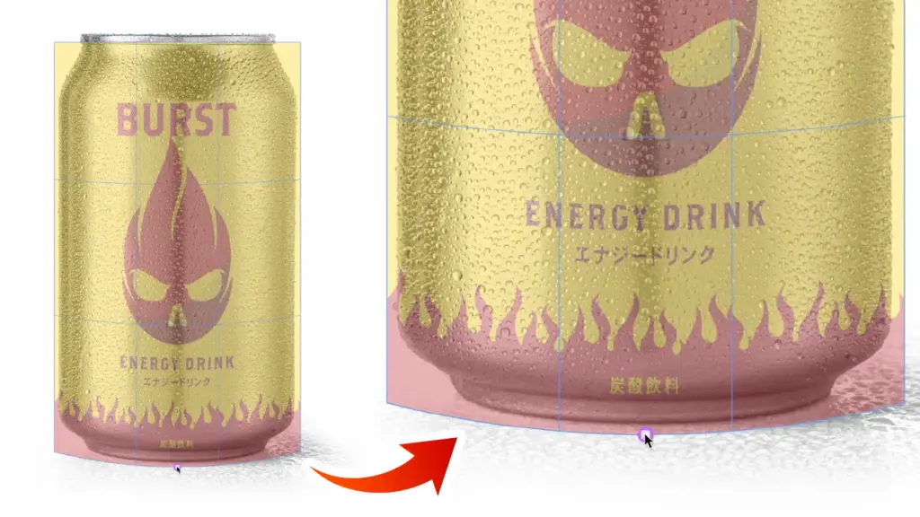ワープグリッドのハンドルを操作して、デザインが缶の曲面に自然に沿うように調整します。特に下の丸みに合わせるのがポイントです。調整が終わったら、Enterキーを押して確定します。