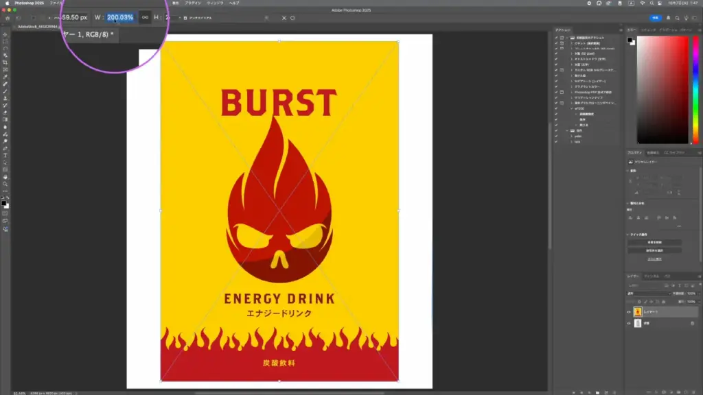 自由変形モードに切り替えて、パッケージデザインを缶の大きさに合わせます。