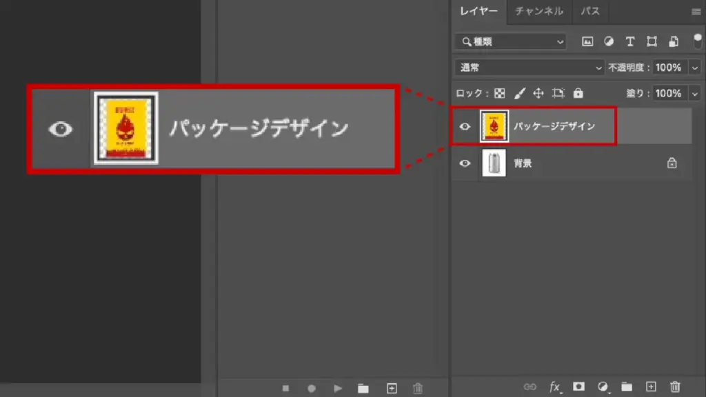 新しくできたレイヤー名をわかりやすいように「パッケージデザイン」などに変更します。