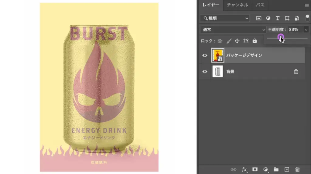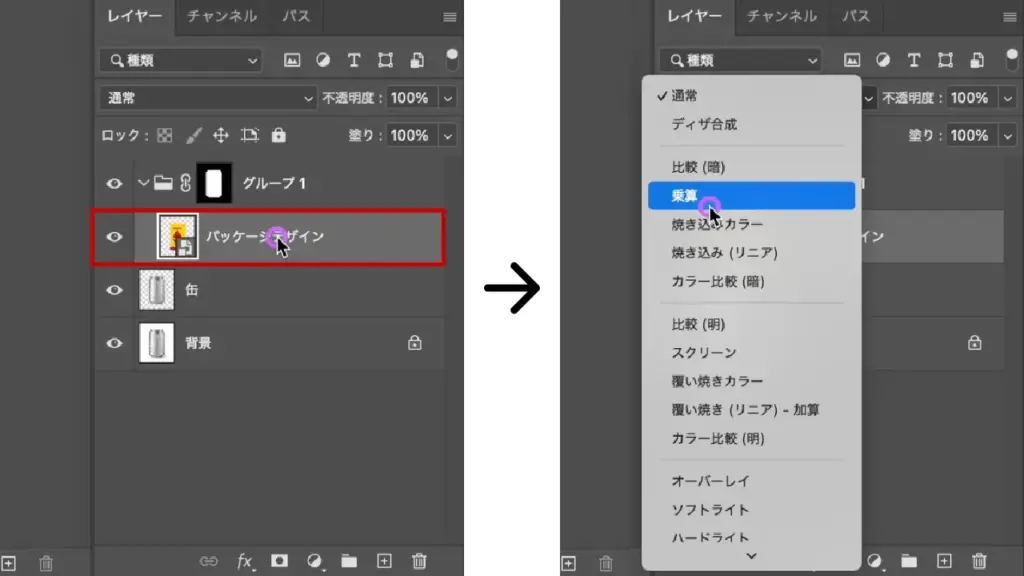 「パッケージデザイン」レイヤーの描画モードを「乗算」に変更します。