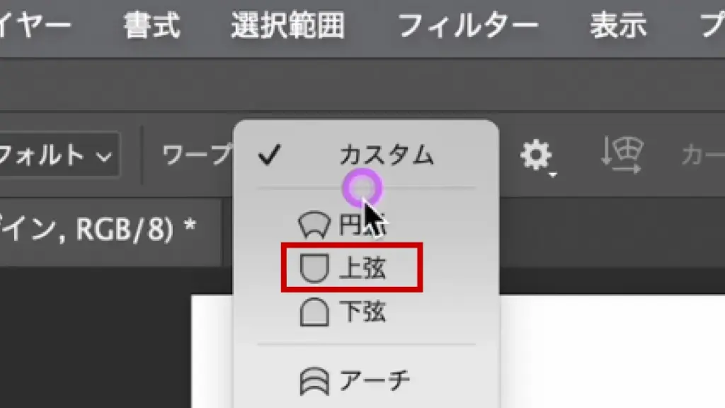 画面上部のオプションバーにある「ワープ」のドロップダウンメニューから「上弦」を選択します。