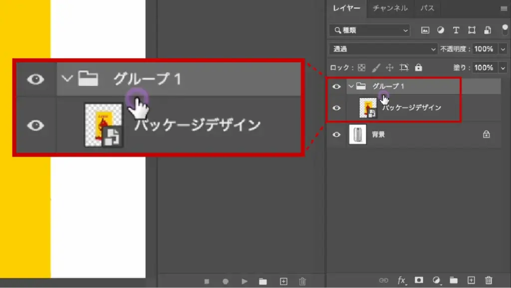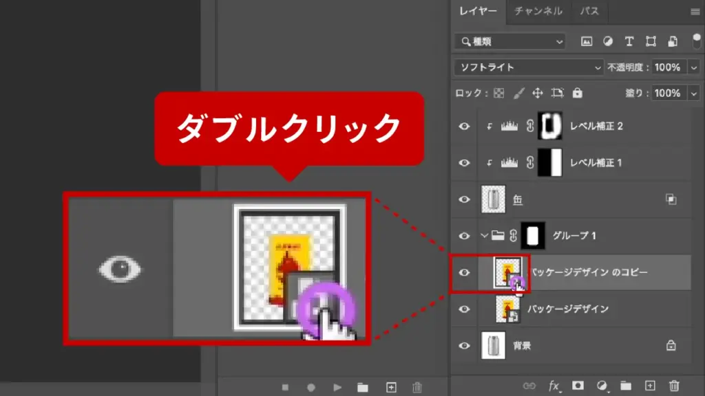 グループ内のスマートオブジェクトになっている「パッケージデザイン」レイヤーをダブルクリックします。