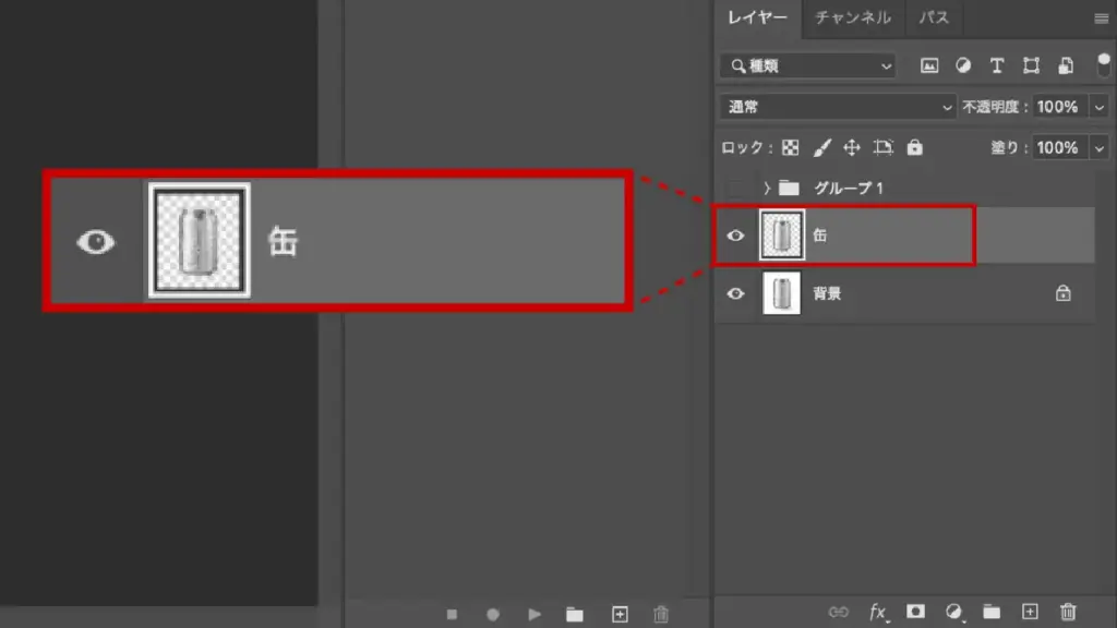 元の画像レイヤー(背景レイヤーなど)を選択し、クイック選択ツールやオブジェクト選択ツールを使って缶本体の輪郭を選択し切り抜きます。切り抜かれた缶のレイヤー名を「缶」にしておきましょう。