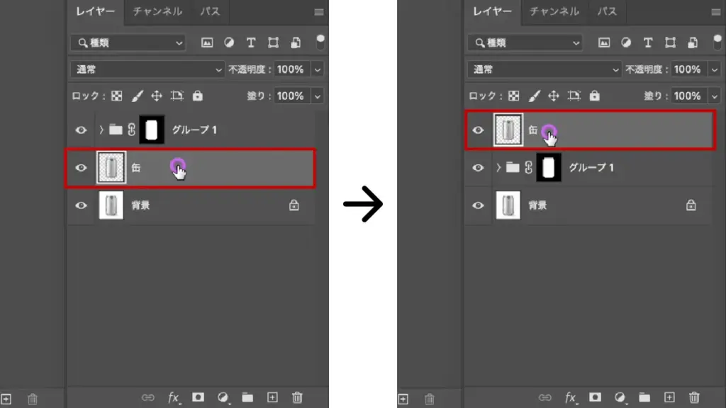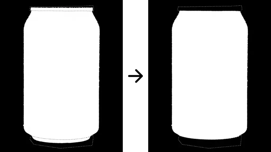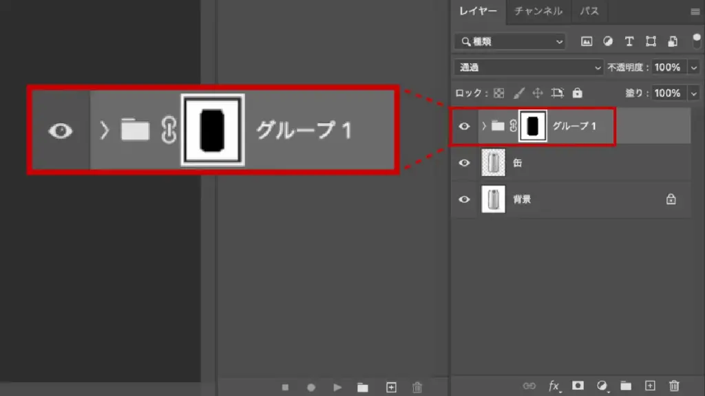「缶」レイヤーのサムネイルを⌘(Ctrl)を押しながらクリックし、缶の選択範囲を読み込み、先程作成したレイヤーマスクを黒く塗りつぶします。