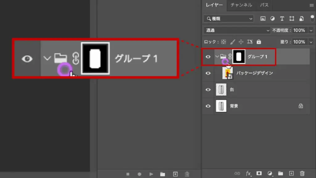 「パッケージデザイン」のグループを選択した状態で、レイヤーマスクを追加します。