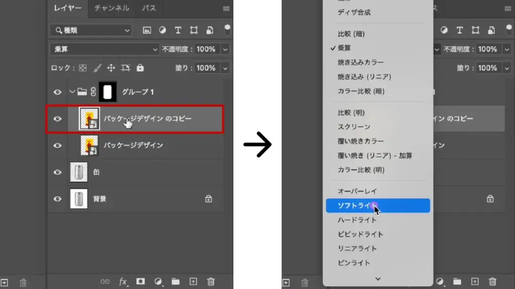 「パッケージデザイン」レイヤーを複製し、描画モードを「ソフトライト」に変更します。