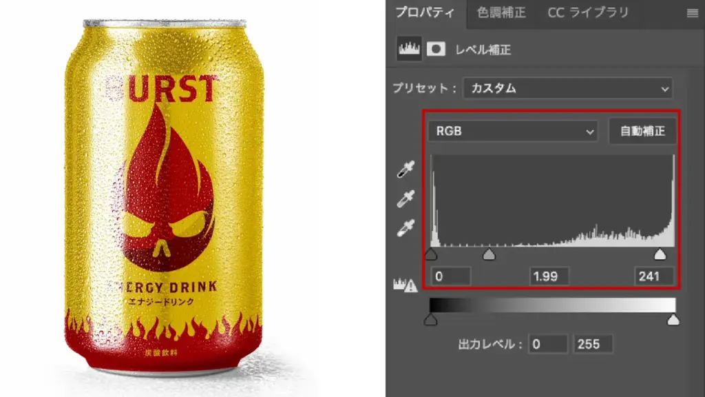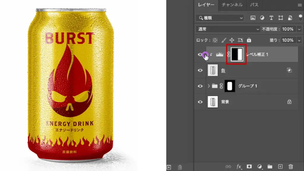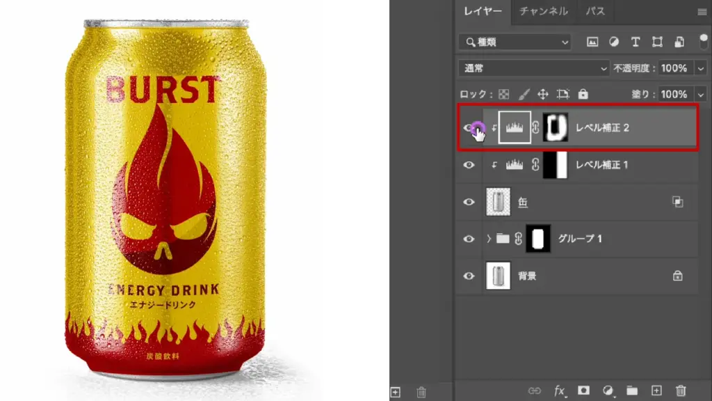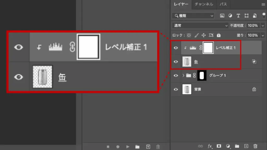 「レベル補正」調整レイヤーを作成し、「缶」レイヤーにクリッピングマスクします。